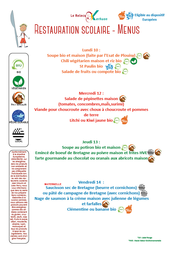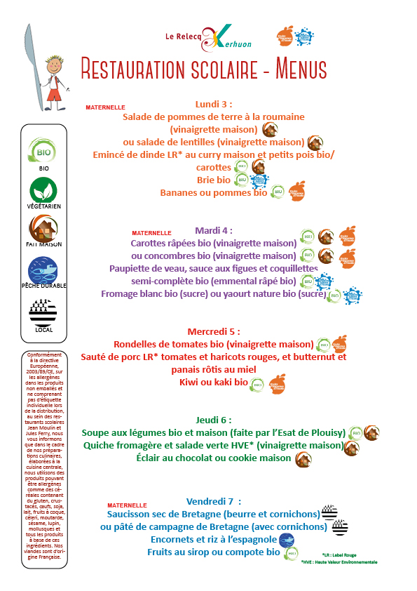 Restauration scolaire Accueil > Petite Enfance, Enfance, Éducation & Jeunesse > Accueils périscolaires > Restauration scolaire Menu du 03/11 au 07/11 Menu du 10/11 au 14/11 Partagez cette page sur