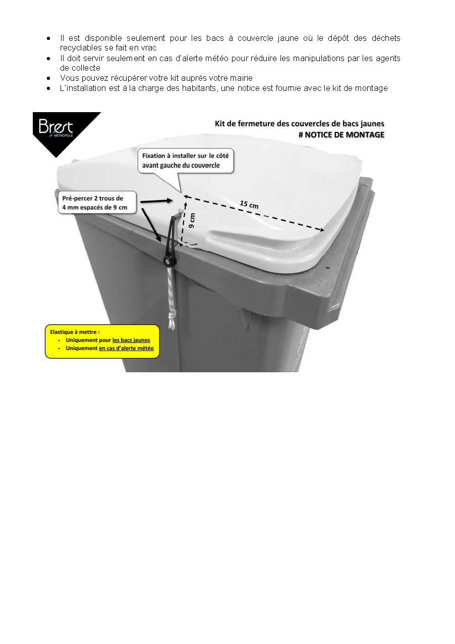 Un système de fermeture pour les bacs à couvercle jaune est proposé par Brest Métropole pour les habitants. L’objectif est de limiter les envols et la dispersion des déchets. Ce qu’il faut savoir : Ce système est mis à disposition gratuitement, dans la limite des stocks disponibles. Il est disponible seulement pour les bacs à couvercle jaune. Il doit servir seulement en cas d’alerte météo, pour réduire les manipulations par les agents de collecte. L’installation est à la charge des habitants, une notice est fournie avec le kit de montage. Les kits sont disponibles à l’accueil de la Mairie, en libre-service. Un seul kit par foyer.